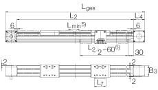 - L2 = 總行程 + 2 x L + 12 + Lmin L tot = 總行程 + 2 x L + 2 x L4 + 12 + Lmin 總行程 = 2 有效行程+ 2 x S (有效行程/滑塊單位: mm) 注意:允差S指一個安全范圍,至少應為85 mm。 最大支撐軌長度 L2 = 8000 mm。