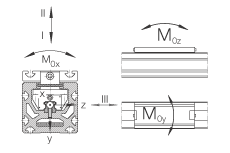 - 滑塊導軌系統的許用靜扭矩 這些數值是單一載荷,當執行器的下部 完全被支撐時使用。當承受聯合載荷時,這些值必須減小。