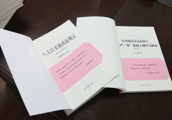 活動中,向副科級以上干部、各黨支部書記每人贈送了《作風(fēng)建設(shè)永遠(yuǎn)在路上—“三嚴(yán)三實”黨員干部學(xué)習(xí)讀本》、《十八大以來廉政新規(guī)定(最新修訂版)》兩本書籍,并附上溫馨的讀書月活動贈言。同時,要求大家把這兩本書作為重要思想行動指南,認(rèn)真學(xué)習(xí),用正確的理論武裝頭腦,深入踐行“三嚴(yán)三實”精神,堅定理想信念,增強黨性修養(yǎng),提升實干精神,筑牢防腐拒變的思想防線。這次活動也將對區(qū)研院經(jīng)濟(jì)健康發(fā)展發(fā)揮積極作用。(胡劍瀟/文)