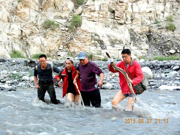 晚上8點半,全部人員到達大河邊。此時距離車輛還有6公里左右的路程,道路完全沖毀,需要過7次河。面對湍急渾濁的河水,大家心里不由得一涼。車就在不遠處,駐地有熱乎乎的飯菜和舒服的床。但是河水實在太大太急。過河有危險,不過河也不行。大家在一起討論了很久,最終決定過河。在河岸來來回回走了好幾次,最終選好渡口,項目負責馮曉強身先士卒,脫掉褲子,拿起河灘上的枯樹枝,穩健地踏入冰冷的河水,一步一步慢慢地摸索著前進。大家都盯著他,只見他離河中心越來越近,突然,河中心泛起了一朵朵白浪,河水打著漩兒。馮曉強的身形一晃,“壞了!他要倒。準備救人!” “不!他穩住了?!贝蠹宜闪艘豢跉?。只見他繼續向河中心進發,慢慢地到了河中心,穩住身形向河對岸艱難地前進,終于到達了淺水區。接著,大家在馮曉強的指引下,一個接著一個,平安地渡過了河。楊西明今年50多歲,身形單薄,只見該老漢老當益壯,過河時穩穩當當,事后被譽為“技術流過河”。年輕小伙程犬身形瘦小,快到河心時險些被沖倒,但是依然頑強前進,順利渡河。渡過一道河,大家信心倍增。隨后相互配合著,順利渡過第二道河、第三道河、第四道河……