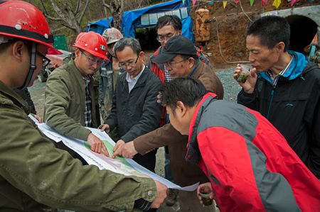 4月13日,陜西地礦總公司總工齊文、副總工黃沙及生產技術部李建軍等前往寧強、漢中等地檢查指導野外工作,我院院長邢憲龍、總工程師趙長纓、安委會辦公室主任郭兵等隨行。在我院冷家溝硐探施工現場,總公司領導認真聽取了項目匯報,仔細查看了硐探效果,對項目工作提出了指導意見。在為期3天的行程中,檢查組還對工貿公司、漢中地質大隊等單位野外項目進行了現場指導。