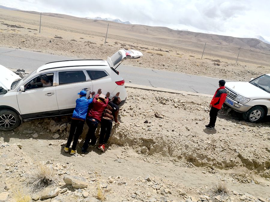 4月20日,我公司西藏分公司徐濤、徐曉飛及司機達瓦頓珠3人赴阿里地區普蘭縣開展項目途中,行至G564國道普蘭段時突遇前方車輛遇險,沖出公路,情況十分危急,徐濤立即要求司機靠路邊停車,帶領同行人員下車查看,經了解,車上共載有5名藏族同胞,由于司機操作不當,導致車輛掉進沙坑,無法行駛,除了車輛輕微受損以外,所幸人員并無大礙。